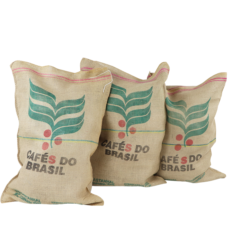 Deze bedrukte jute koffiezakken zijn gevuld geweest met koffiebonen. Dit zijn gebruikte jute koffiezakken die gebruikt werden door koffiebranders om koffiebonen in te bewaren. Doordat jute een sterke stof is en ook goed ventileert zijn deze zakken ideaal om koffiebonen in te bewaren. Deze zijn strak op elkaar geweven en vormen zo een stevige maar luchtdoorlatende zak.
