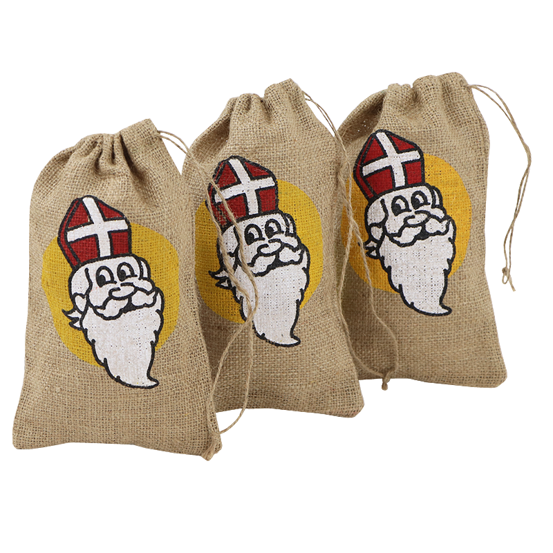 Hier zijn creatieve ideeën om jute zakken met Sinterklaas-opdruk te combineren met gepersonaliseerde labels of namen, perfect voor een feestelijke en persoonlijke touch: